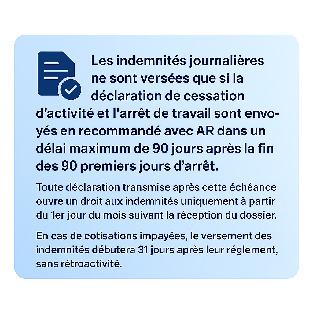 La CARCDSF ne finance pas directement le congé maternité : c’est la CPAM qui indemnise. La CARCDSF intervient uniquement dans les situations d’arrêt maladie lié à la grossesse, mais toujours après 90 jours.